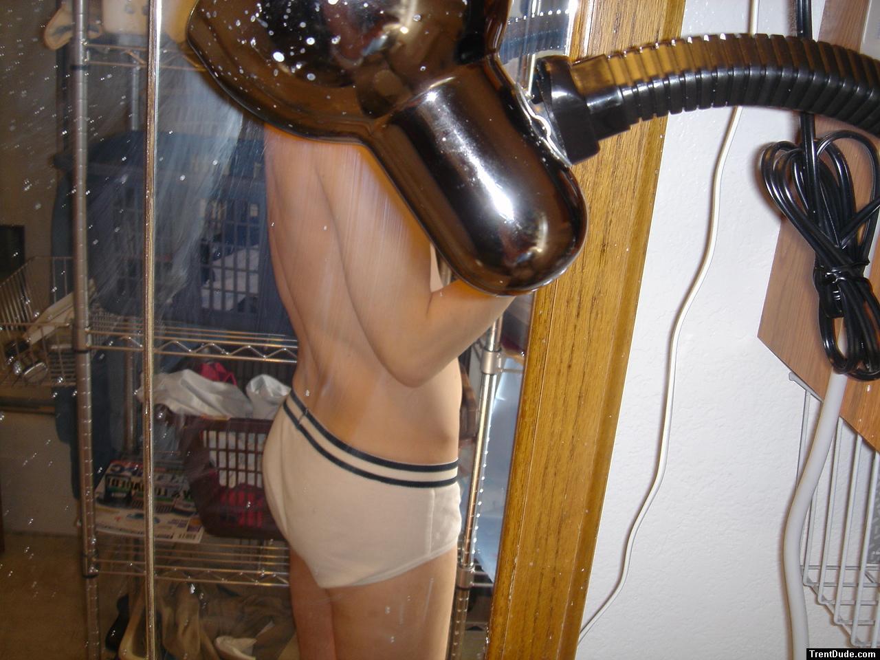 Nude Swimmer pulling down his swim suit in the shower