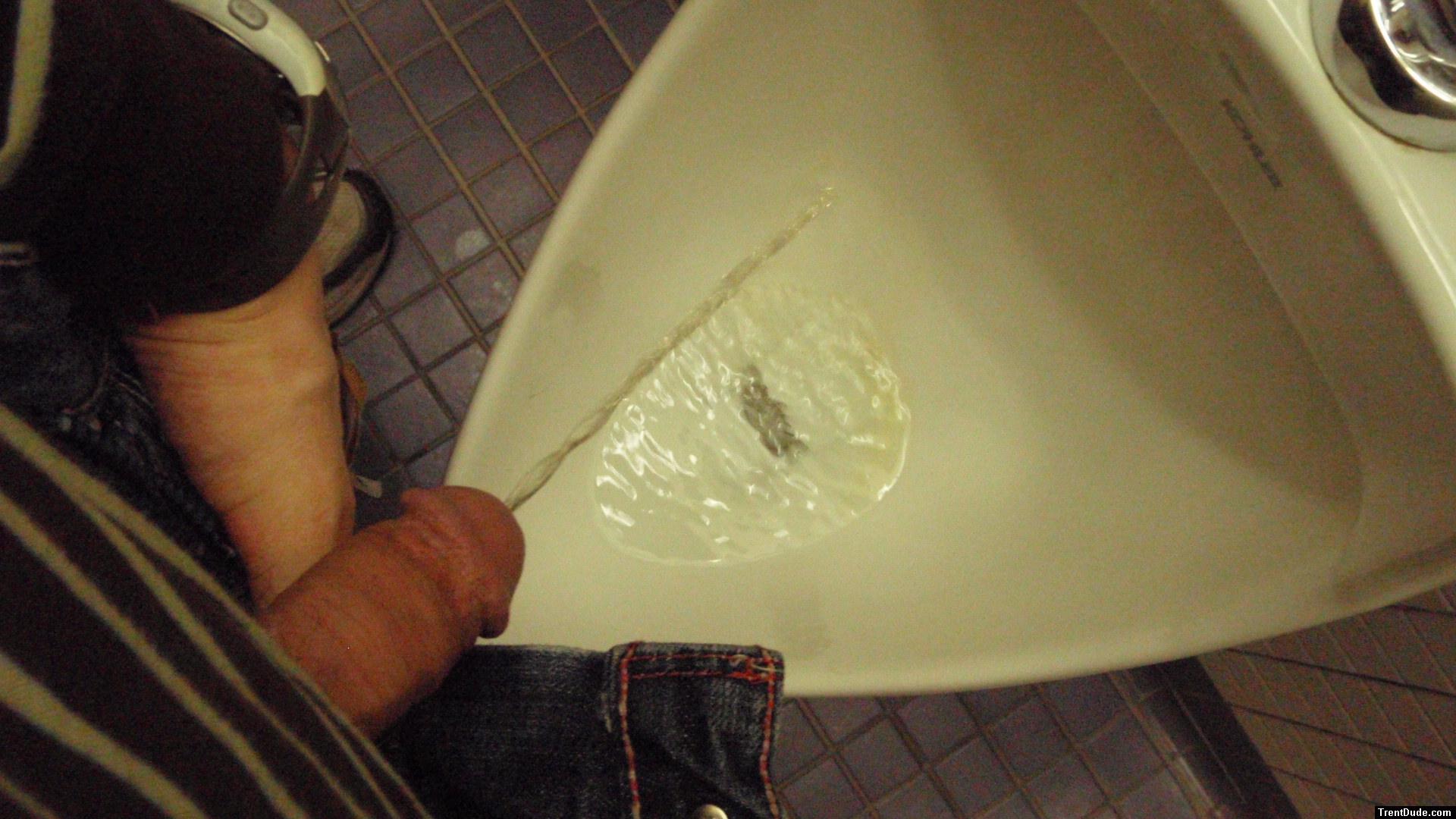 Peeing clear pee in a urinal, to show that urine may be clear after drinking large amounts of water
