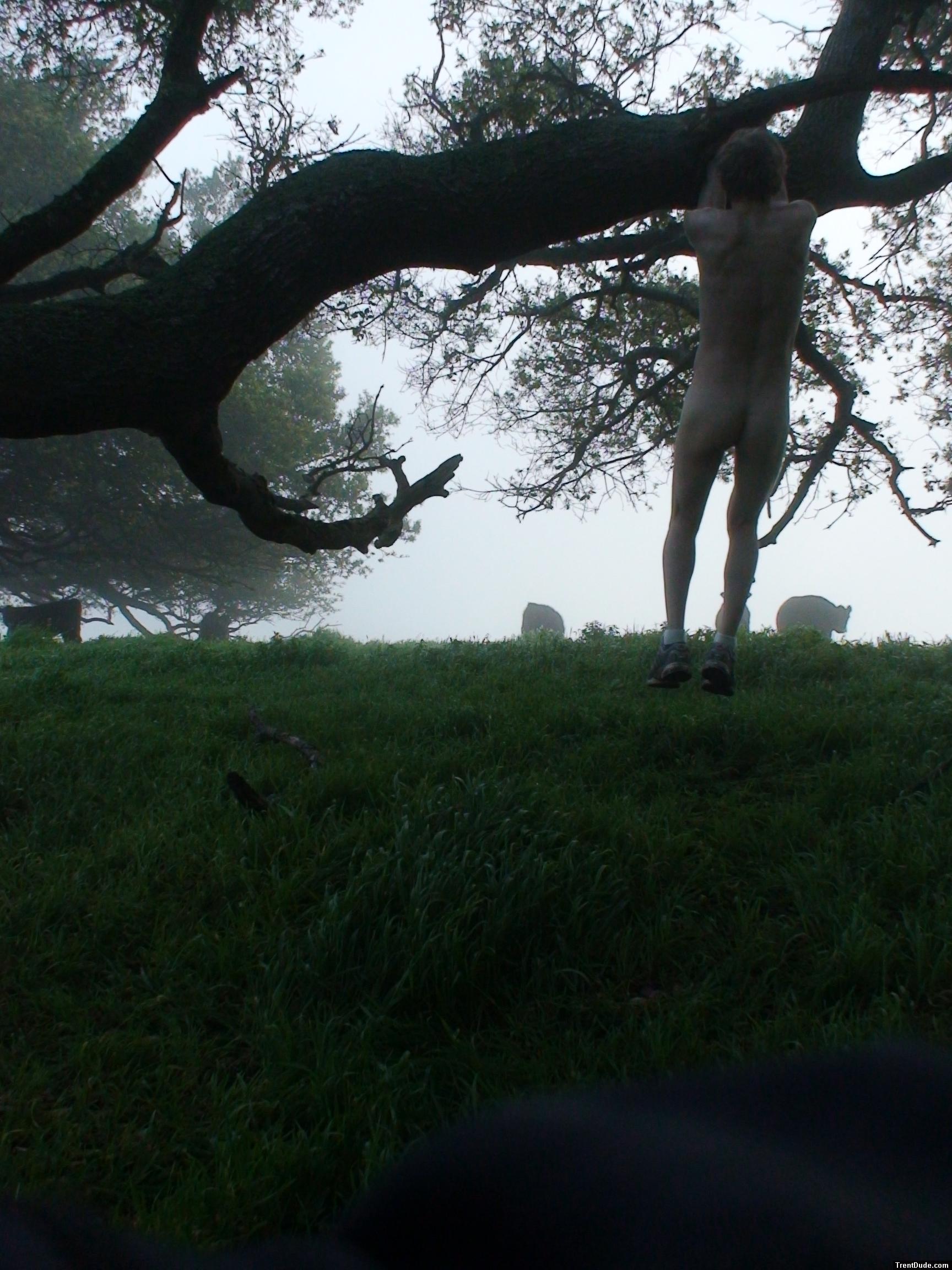 Hanging from a tree branch nude