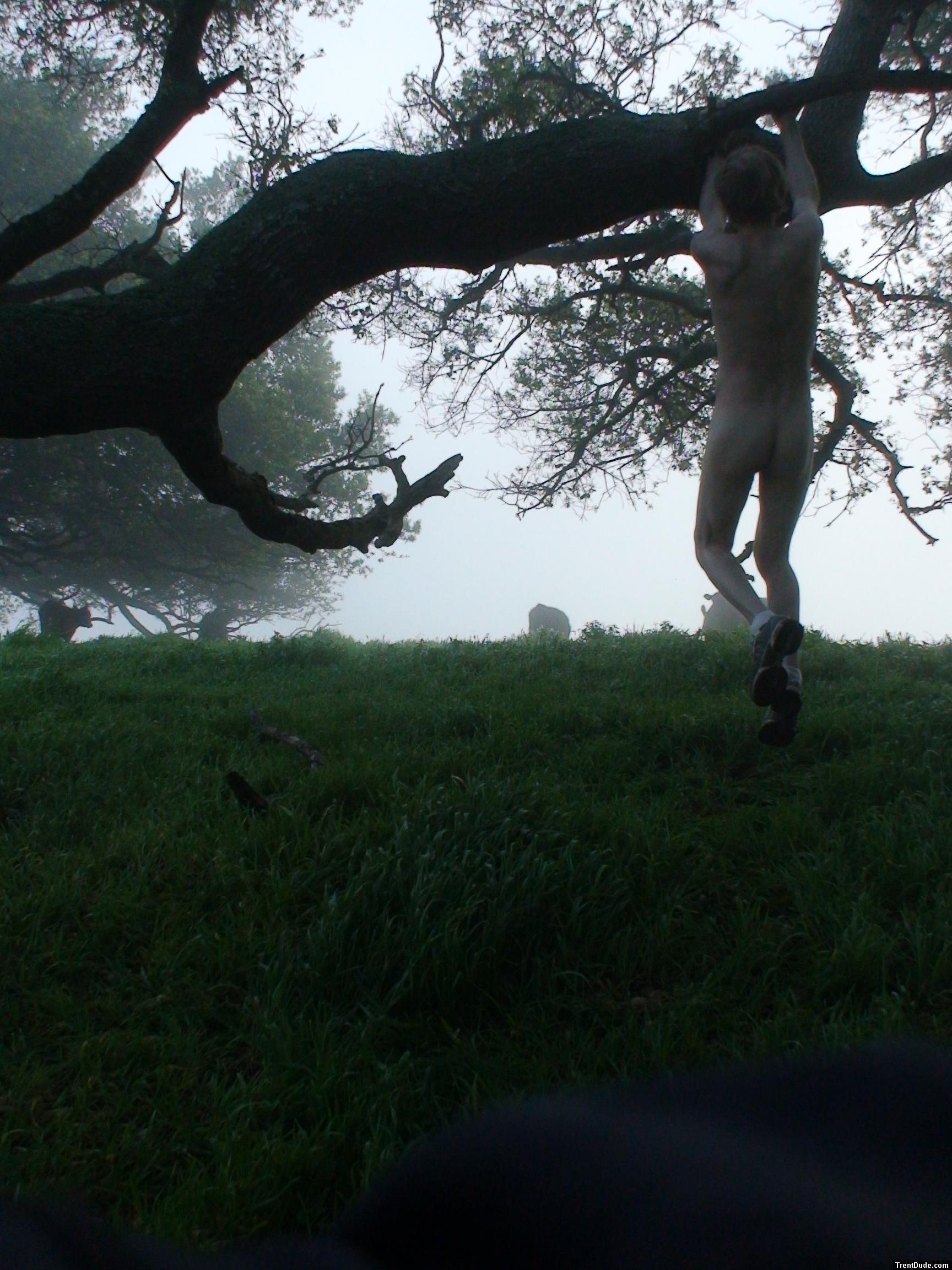 Hanging from a tree branch nude
