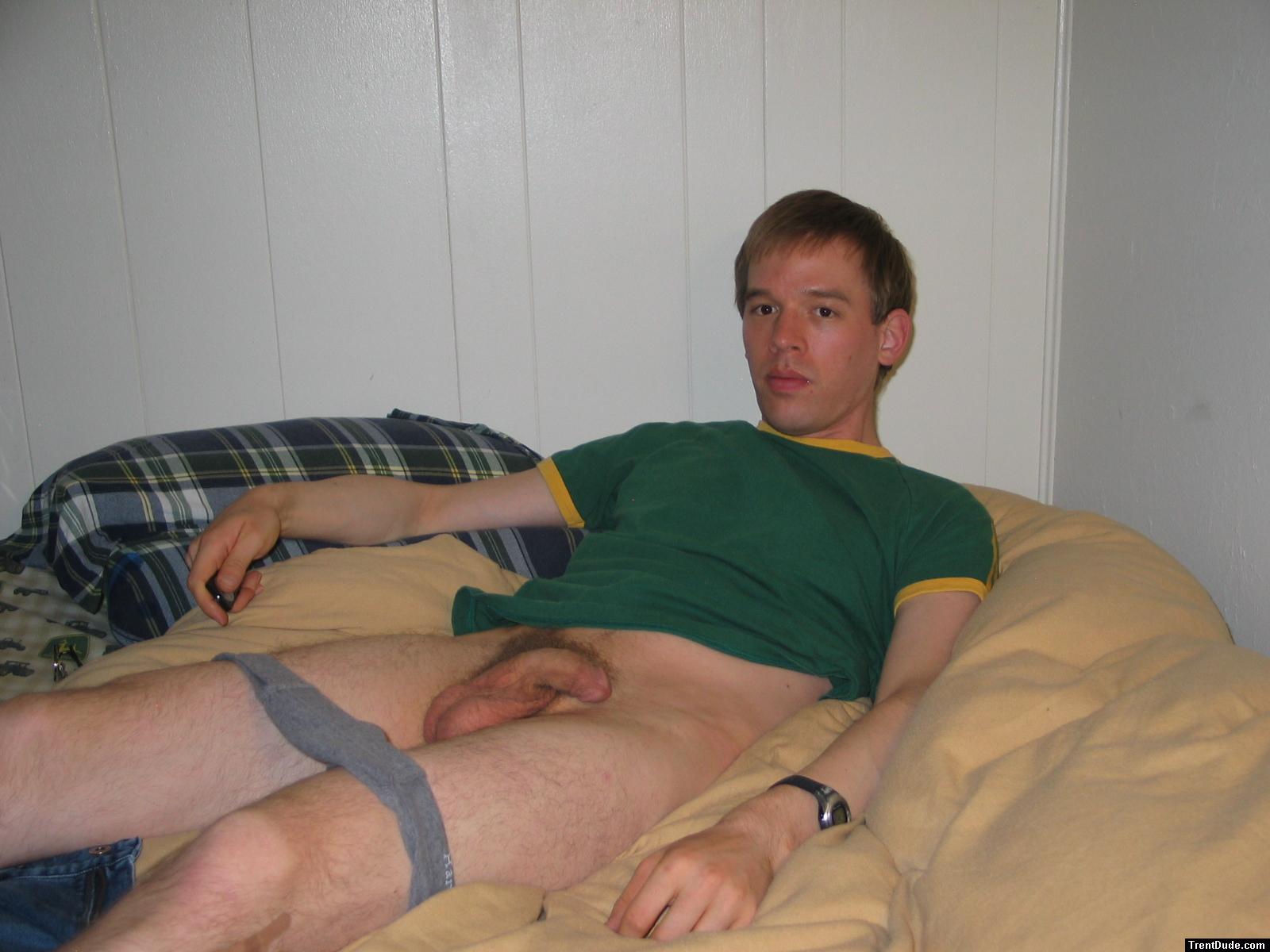 Nude in bed with green shirt
