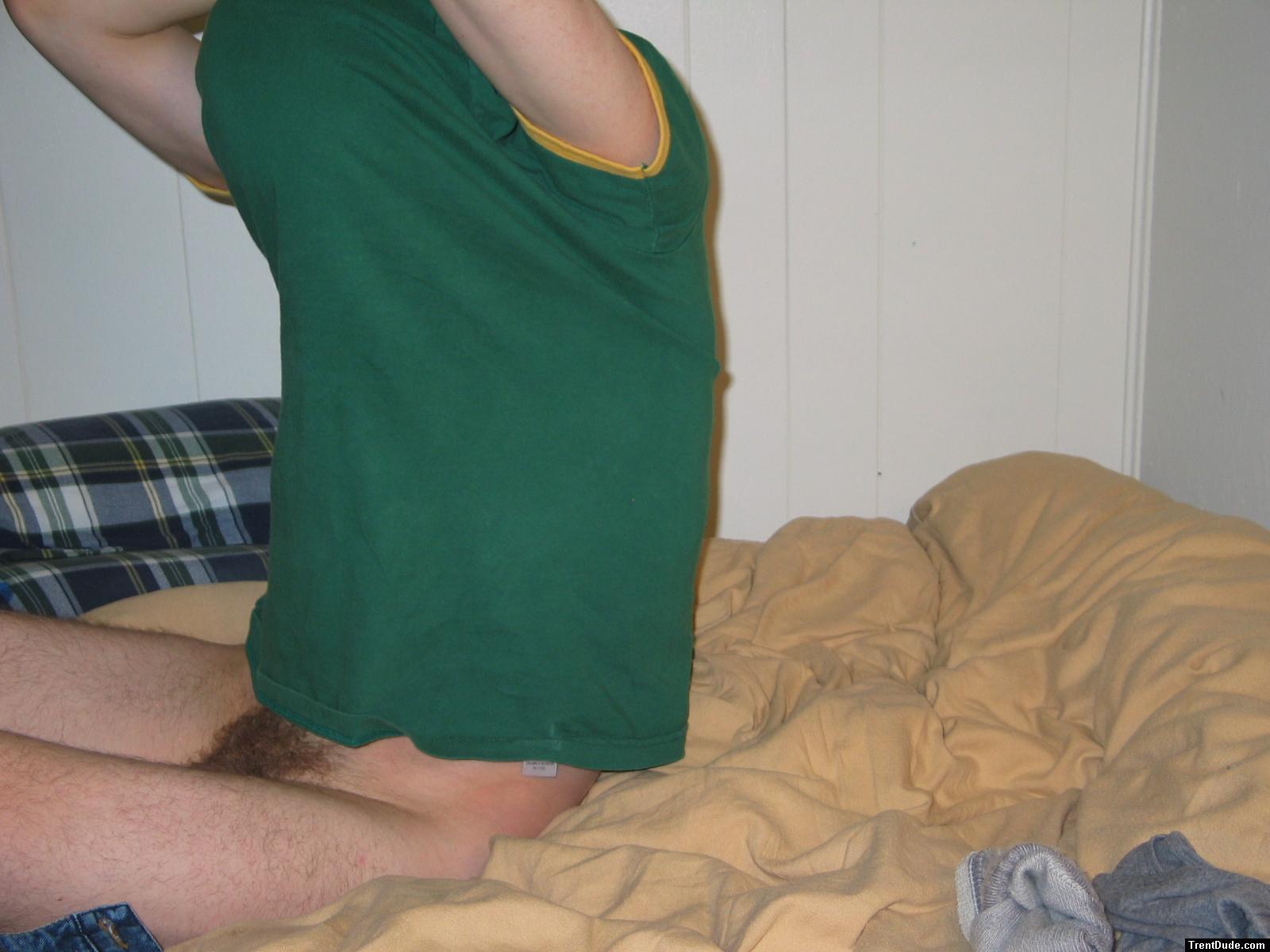 Nude in bed with green shirt