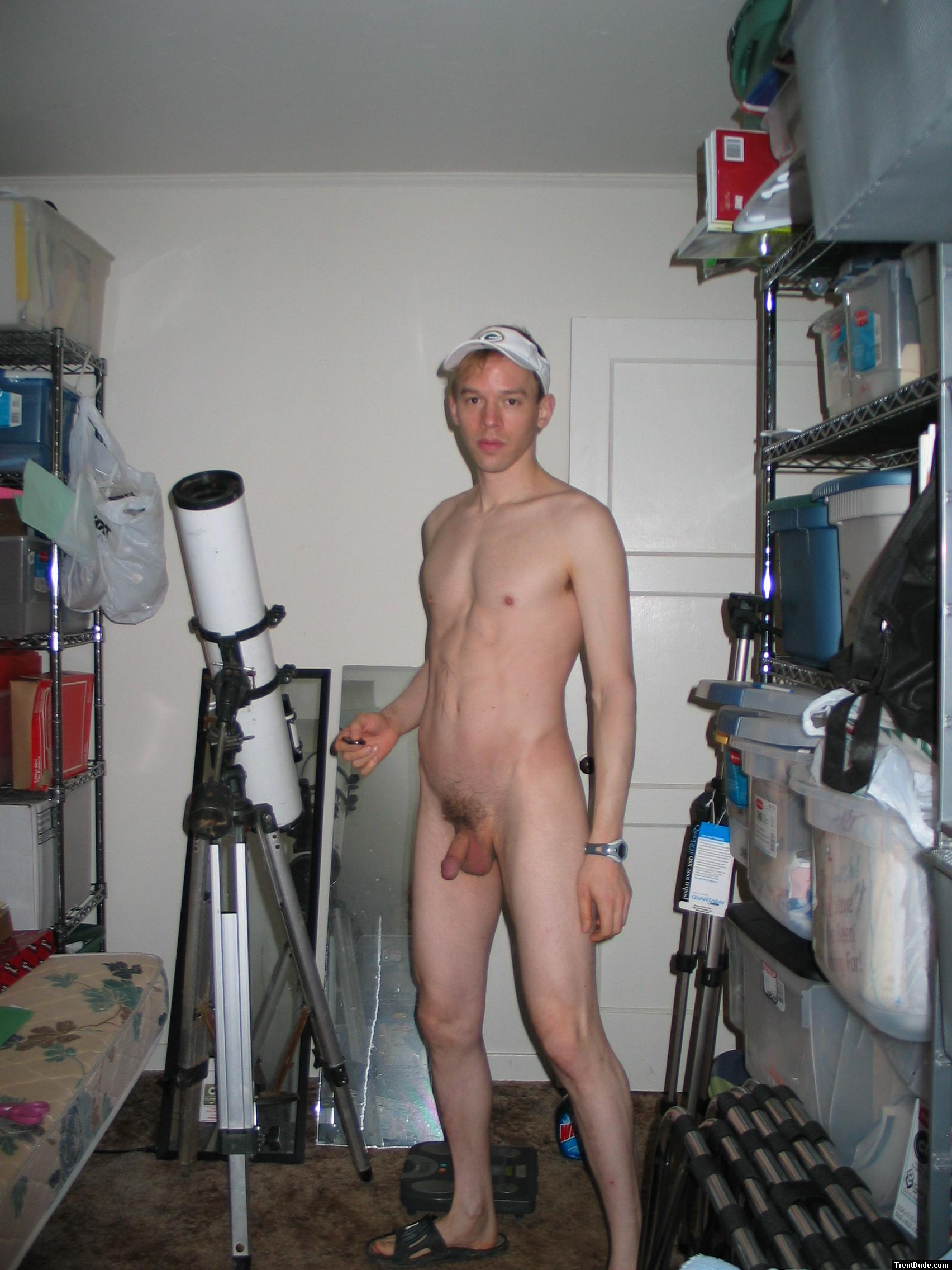 Standing nude by a telescope