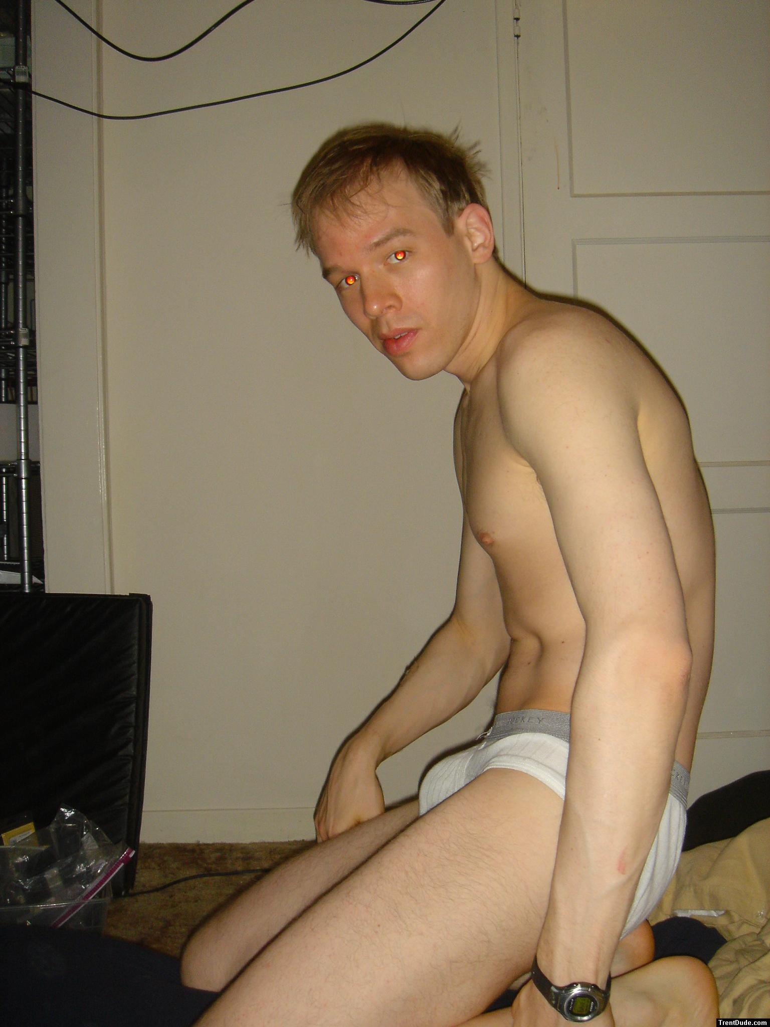 Nude in the locker room, green underwear, chest hair